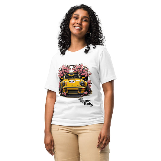 Fancy Bois Yellow Porsche 911 Carrera Cherry Blossom White Tee